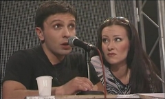 Кроме того, в "Дне радио" весьма деятельное участие принимает группа "Несчастный случай" во главе с Алексеем Кортневым: они изображают различных музыкантов марафона и исполняют десять песен, написанных специально для спектакля. Также в спектакле звучат голоса Алексея Булдакова, Эммануила Виторгана, Лолиты, Клары Новиковой, Ксении Стриж, Николая Фоменко, Владимира Шахрина и группы "Чайф". Как все это смотрится и слушается? Просто классно! Я до последнего момента не верил, что все превосходные эпитеты, которые употребляли в отношении этого действа, верны, но оказалось, что практически все так и есть - это великолепный спектакль! Причем вроде ничего такого уж совсем изумительно-потрясающего - именно капустник, но это тот самый случай, когда обстановка капустника создает буквально юмористическую фантасмагорию.
